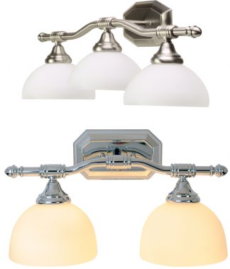 Uses 60-W max. medium (E26) base bulbs (not included)Read moreITEM # SIZE # OF LIGHTS COLOR/ FINISH QTY. 617075 5-½ x 7-½ H 1 CHROME 1/4 617077 18 x 9 H 2 CHROME 1/4 617078 24 x 9 H 3 CHROME 1/4 617085 24 x 9 H 3 BRUSHED NICKEL 1/4 -