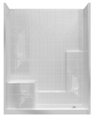 Includes curtain rod, stainless steel grab bars, white fold-up seat, and factory-installed easy base pre-leveled shower base