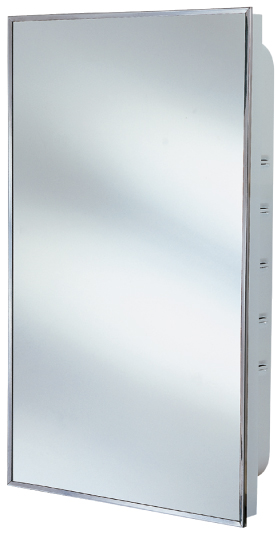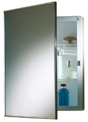 This recessed swing-door medicine cabinet has a polished stainless steel frame and a white, polystyrene body