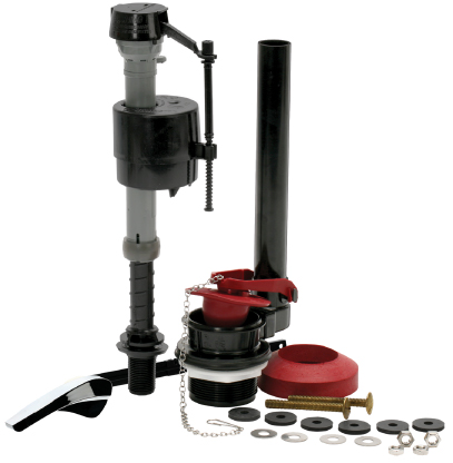 Kit includes the topselling 400A fill valve, flush valve with Bull’s Eye adjustable flapper, chrome handle tank lever, and a gasket with bolts