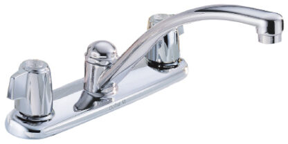 Commercial-use, 2-handle, widespread, gooseneck faucet with red/blue indicators,