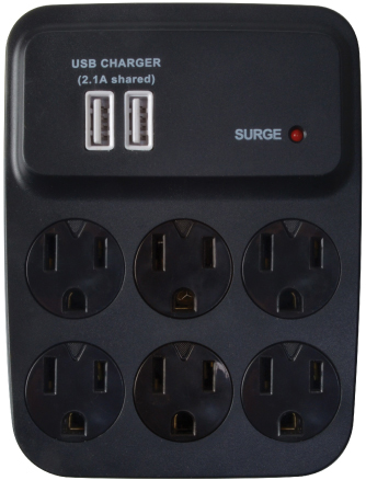 900 joules surge protection, 6 grounded outlets, rotatable outlet safety covers, surge LED indicator, and includes cradle accessory for smaller electronic devices