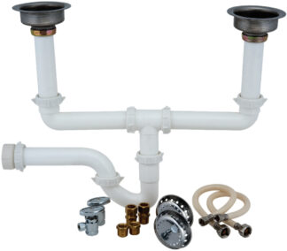 Includes 2 – 1/2″ IPS x 38″ OD comp angle valves, 2 – 58″ OD tube comp x 1/2″ male pipe thread unions, 2 – 1/2″ male pipe thread x 38″ female pipe thread reducing bushings, 2 – 38″ comp x 1/2″ FIP braided flex PVC water conector 16″ long, 1 – 1/2″ OD center outlet waste, 2 – 1- 1/2″ OD x 6″ sink tailpieces, 1 – 1- 1/2″ P-trap, 7 – 1- 1/2″ ID polyethylene washers, 2 – 1- 1/2″ tailpiece washers, 1 – 1- 1/2″ x 1- 14″ reducing washer, 1 – 1- 1/2″ solvent weld adapter, 2 -stainless steel sink strainers, and 1 – 1/2″ x 260″ teflon tape