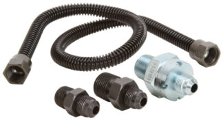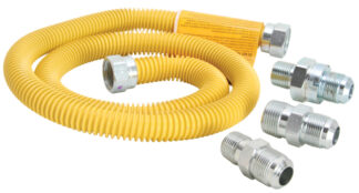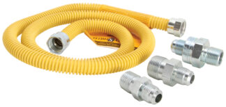 Contains (1) 58″ OD x 48″ yellow coated stainless steel conector (2) Standard fittings (1) 1/2″ male pipe thread (tapped 38″ female pipe thread) (1) 34″ male pipe thread (tapped 1/2″ female pipe thread) (1) SuperSense excess flow valve fitting – 1/2″ male pipe thread (tapped 38″ female pipe thread) Plus (1) thread sealand (1) leak test solution (1) detailed installation guide